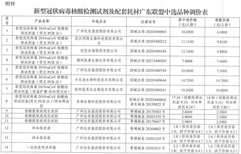 在此次湖南省公共资源交易中心发布的通知当中,湖南省针对广东联盟中标新冠检测试剂盒产品实行再度降价。达安、明德、迈克等新冠试剂从两位数价格降到10元以下;卡尤迪、优思达等相关产品已掐掉“零头”;而达安的样本保存液、一次性使用采样器等配套产品均降到两元以下。